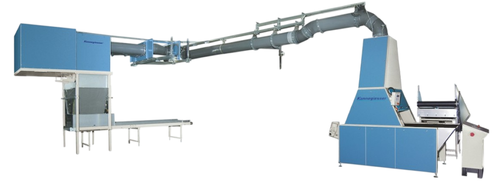 As replacement and in addition to conventional container technologies, the AERO vacuum transport system is equipped with a suction pipe, which offers a variety of possibilities to plan the distribution of laundry. Additionally, space is saved and processing time is reduced. Linen can be transported from between washing, drying and finishing areas at your will. For example, The AERO-System can also be used to transport wet or dry laundry items from a transfer or loading conveyor to the subsequent processing stations such as tunnel finishers, feeding machines or dry laundry folders.