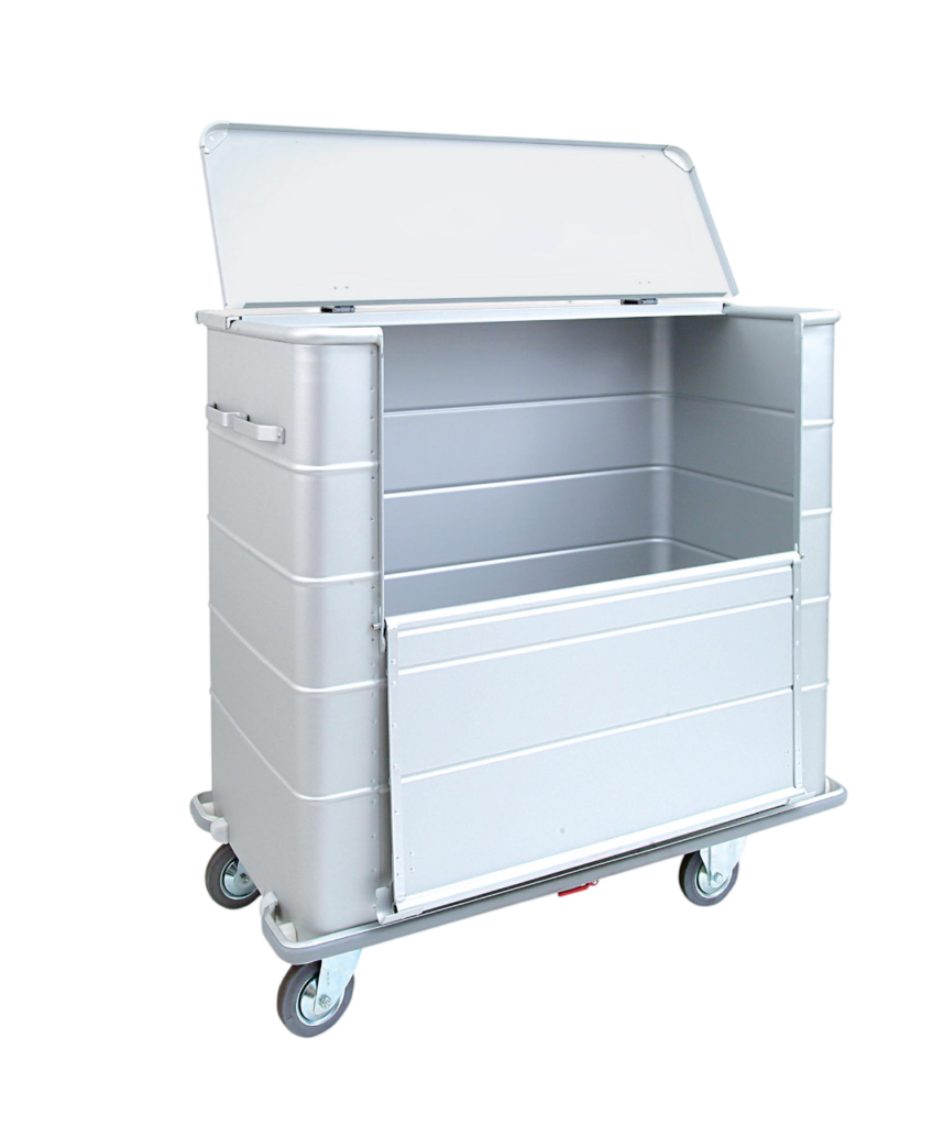 Heavy-duty aluminium trolley/ container designed for transport, storage, and handling of dirty linen or bulky items in commercial, healthcare, and industrial laundry environments.