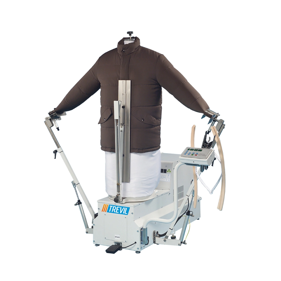 Finishes garments without tension while ensuring excellent shape recovery. - Sleeve Arms with Pneumatic Clamps